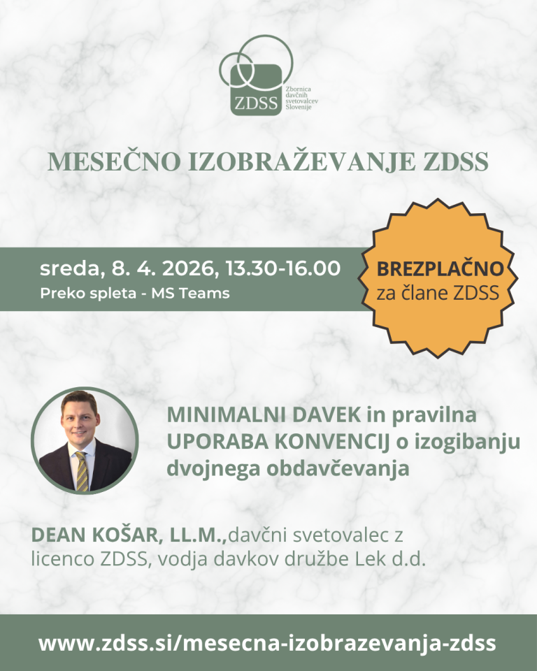 Vabljeni na mesečno izobraževanje Zbornice davčnih svetovalcev Slovenije, kjer bosta predstavljena dva sklopa tematik: Minimalni davek in pravilna uporaba konvencij o izogibanju dvojnega obdavčevanja.
